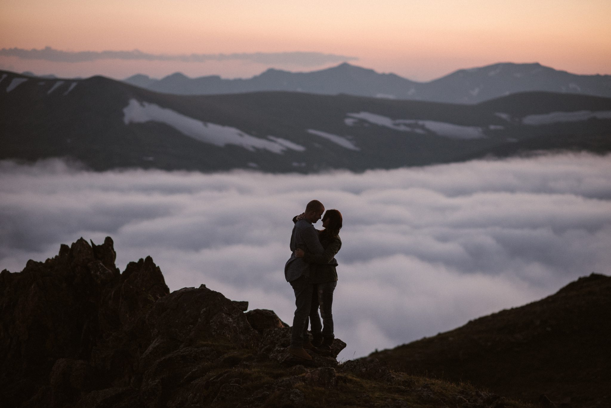 Our first trip out was in August of 2017. We stayed in Buena Vista & Estes and chose Trail Ridge Road at RMNP as our engagement photos location spot. Dylan & I can both tell you, the moment we got out of the car in Buena Vista we felt like we were home. We went straight to Cottonwood Pass before even checking into our Air BnB because we couldn’t contain ourselves. We had already picked out Cottonwood as a possible elopement spot based off how remote it was but yet still close to town. We originally didn’t plan on hiking because I felt a little overwhelmed thinking about having to get up at dark and freeze with a dress (see my later post about why I was SO WRONG!) What I saw in those first 5 minutes out walking out at the pass in the cold rainy fog is genuinely something I will never forget. On the plane home I cried that I had to leave, and Dylan won’t admit it but he teared up. He also started looking for jobs in Buena Vista the day we got back…